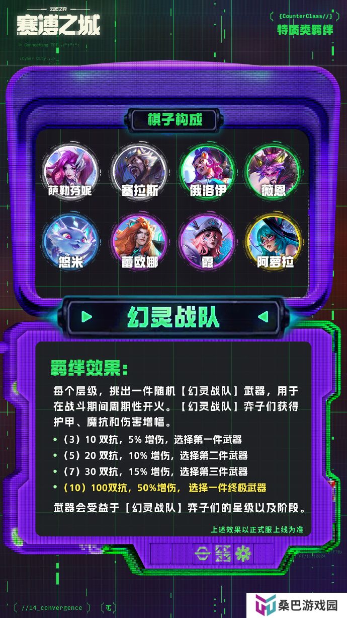 每个层级,挑出一件随机【幻灵战队】武器,用于在战斗期间周期性开火。【幻灵战队】弈子们获得护甲、魔抗和伤害增幅。