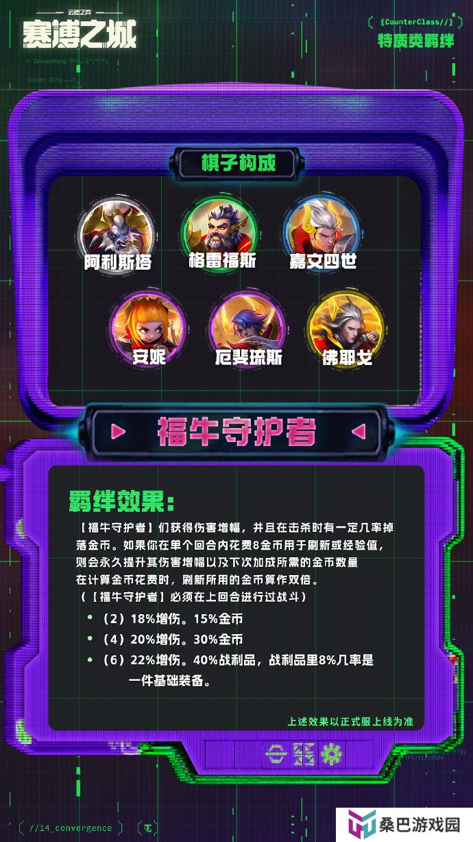 【福牛守护者】们获得伤害增幅,并且在击杀时有一定几率掉落金币。如果你在单个回合内花费8金币用于刷新或经验值,则会永久提升其伤害增幅以及下次加成所需的金币数量在计算金币花费时,刷新所用的金币算作双倍