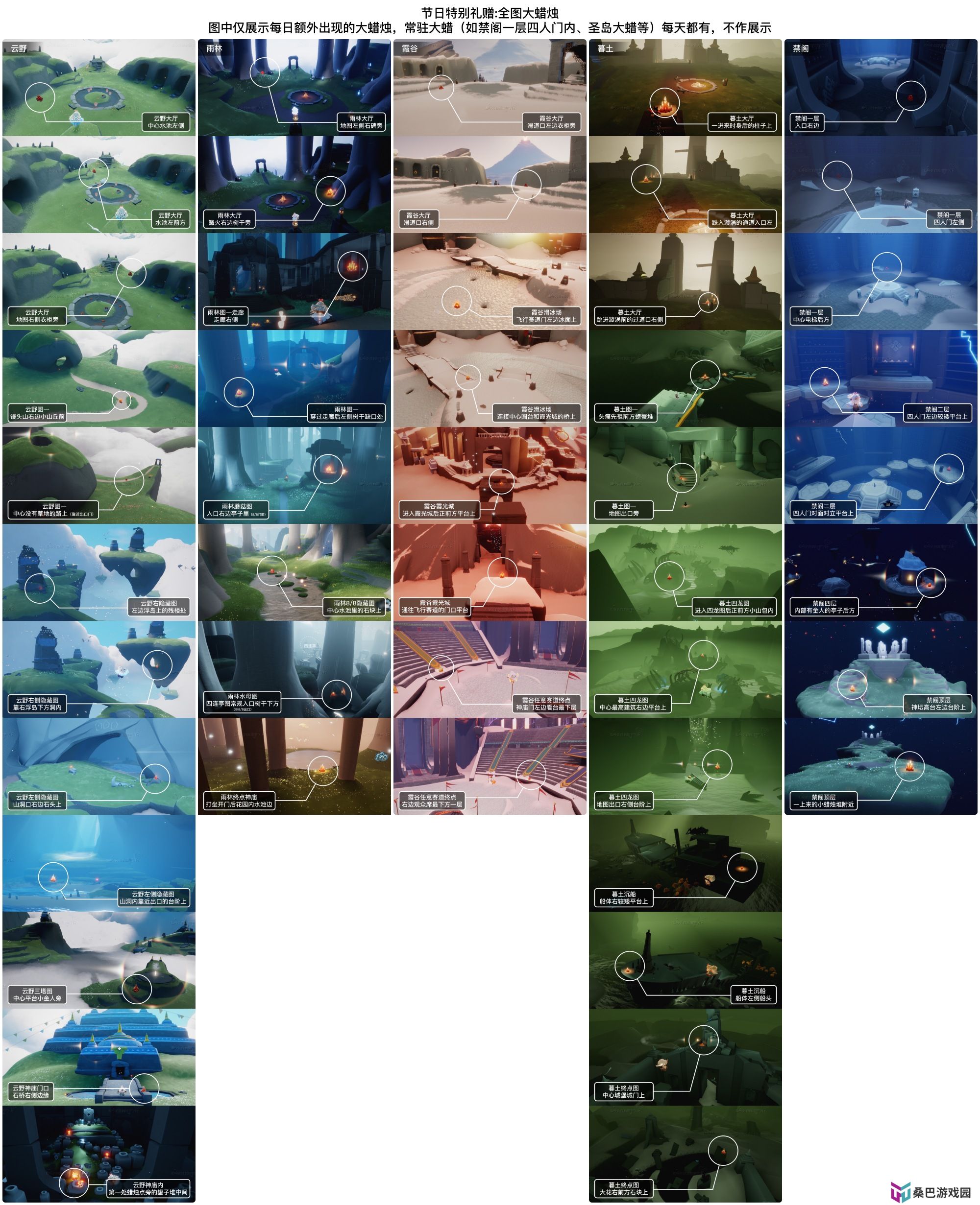 光遇今天的大蜡烛刷新在了云野雨林霞谷暮土禁阁这5张地图,那么大家知道3.25每堆大蜡烛的具体位置在哪里吗?下面为大家带来光遇3月25日大蜡烛位置的具体内容,感兴趣的玩家们千万不要错过哦!