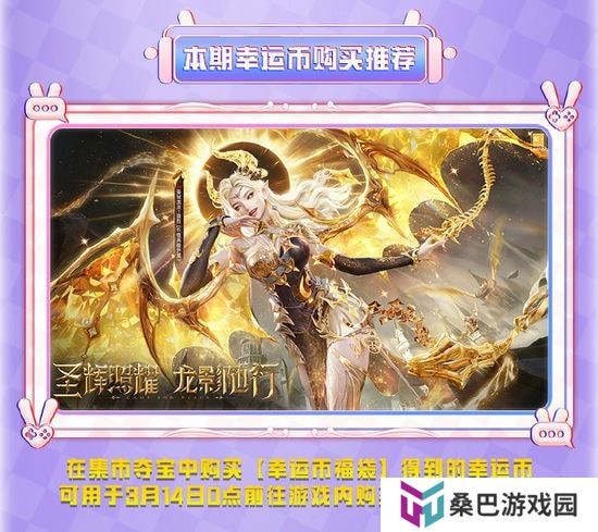 在集市夺宝中购买【幸运币福袋】得到的幸运币,可用于3月14日0点前往和平精英游戏内购买【圣域龙灵】以及其他神装、载具皮肤等。